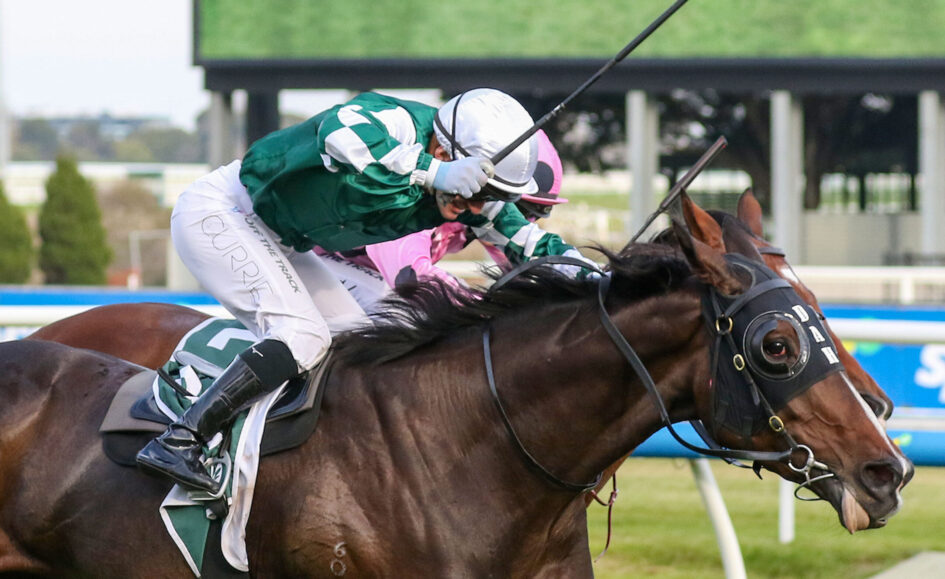 Jockey Luke Currie settled Aztec State in third-last position at Caulfield, but made a wide run from the 700m and after holding his ground rounding the home turn, the gelding finished stoutly in the home straight.