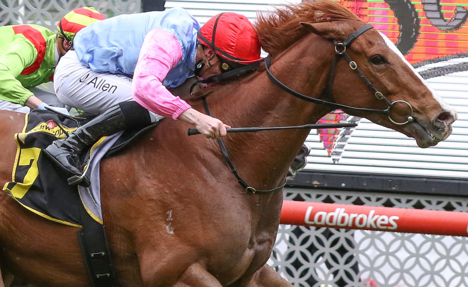 Under the urgings of John Allen, Just Folk ($15) scored a half-length win from Begood Toya Mother ($19) with the $1.90 favourite Elephant a half-neck away third.