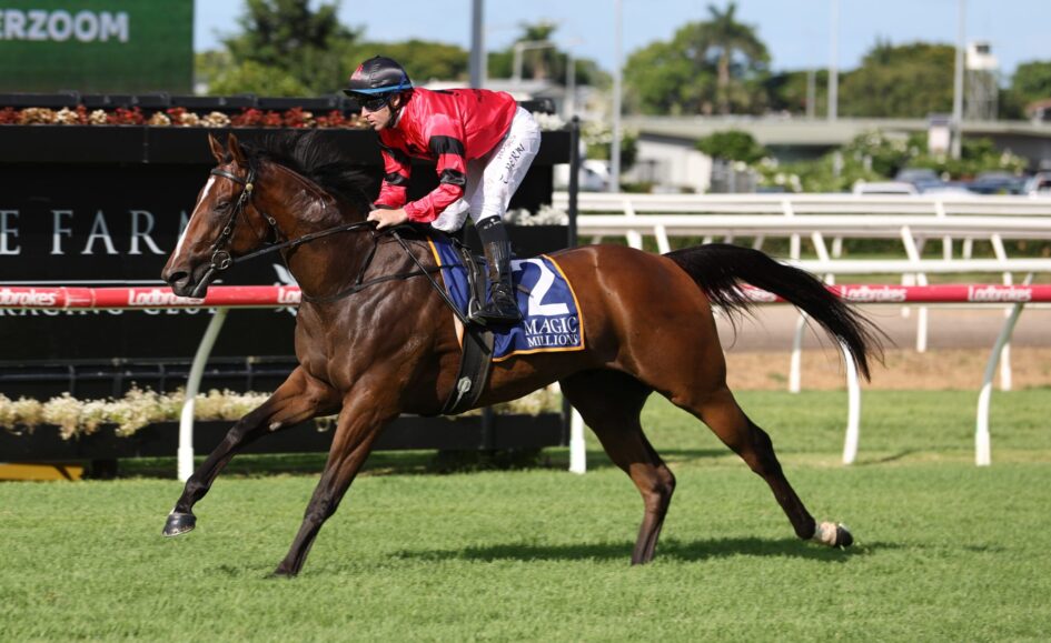 Ninja ($2.30F), the talented three-year-old gelding, produced a devastating finish to score a near five-length win in the Group 3 Vo Rogue Plate (1300m), reinforcing his status as the horse to beat in the $3 million Magic Millions 3yo Guineas (1400m) at the Gold Coast.