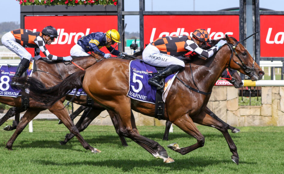 Warnie, well supported at $11, unleashed a powerful finishing burst down the middle of the track to reel in the $2.20 favourite Private Eye, scoring by a half-head, with Arkansaw Kid ($10) closing off for third.